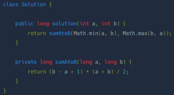 두 정수 a, b가 주어졌을 때 a와 b 사이에 속한 모든 정수의 합을 리턴하는 함수, solution을 완성하세요.