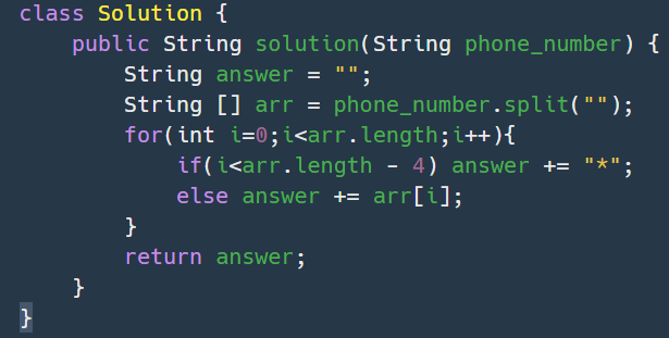 전화번호가 문자열 phone_number로 주어졌을 때, 전화번호의 뒷 4자리를 제외한 나머지 숫자를 전부 *으로 가린 문자열을 리턴하는 함수, solution을 완성해주세요.