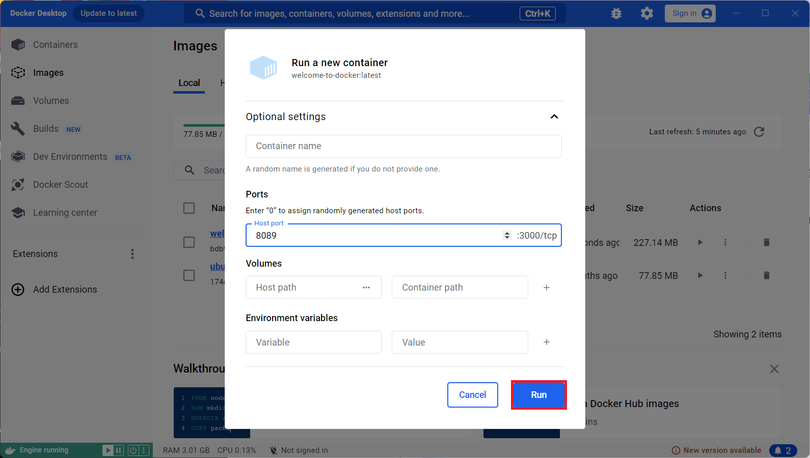 이미지를 컨테이너로 실행하는 방법은 다음과 같다.