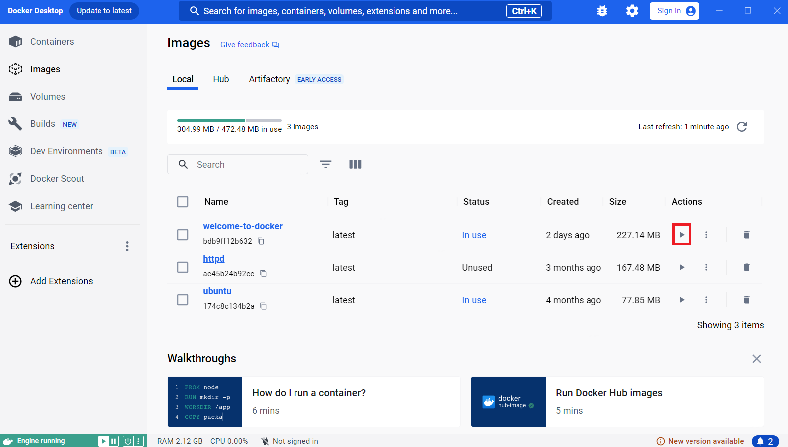 실행하고자 하는 이미지 옆에 있는 '실행'을 클릭.